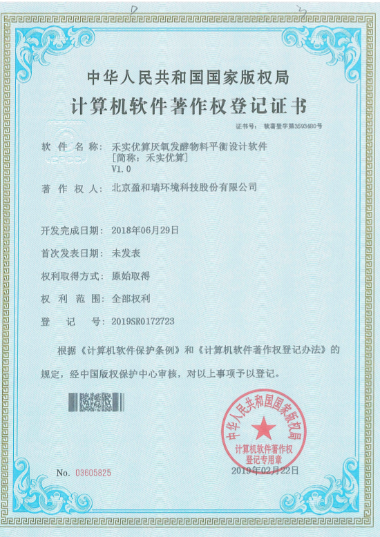 Recently, the “balanced design software targeting anaerobic fermentation materials” jointly developed by Beijing Yingherui Environmental Technology Co., Ltd. and Beijing University of Chemical Technology obtained the software copyright registration certificate issued by National Copyright Administration of the People’s Republic of China.