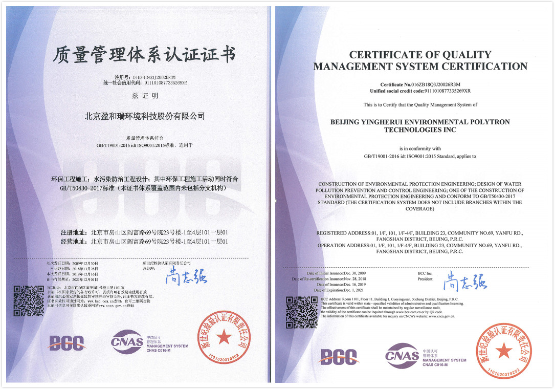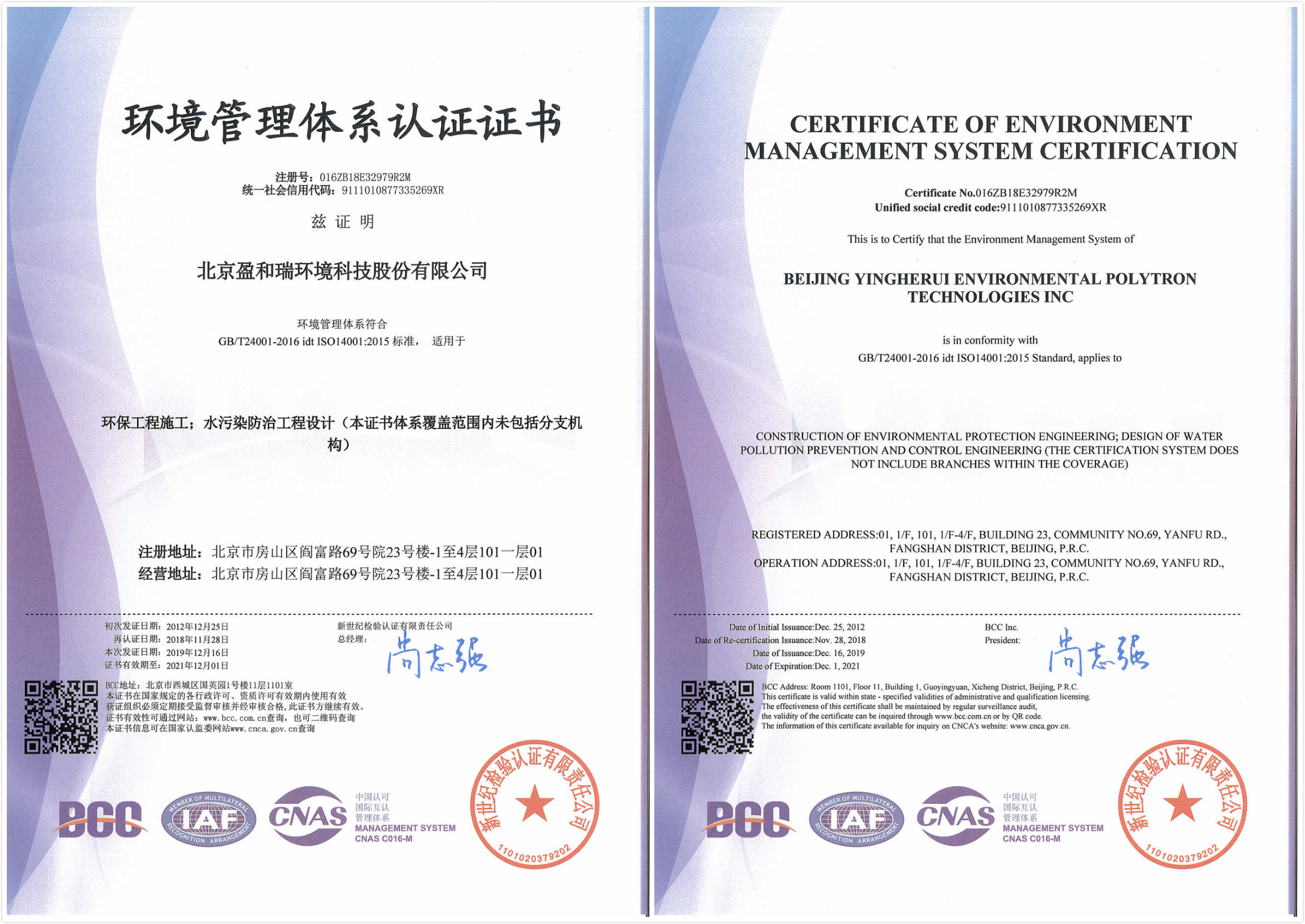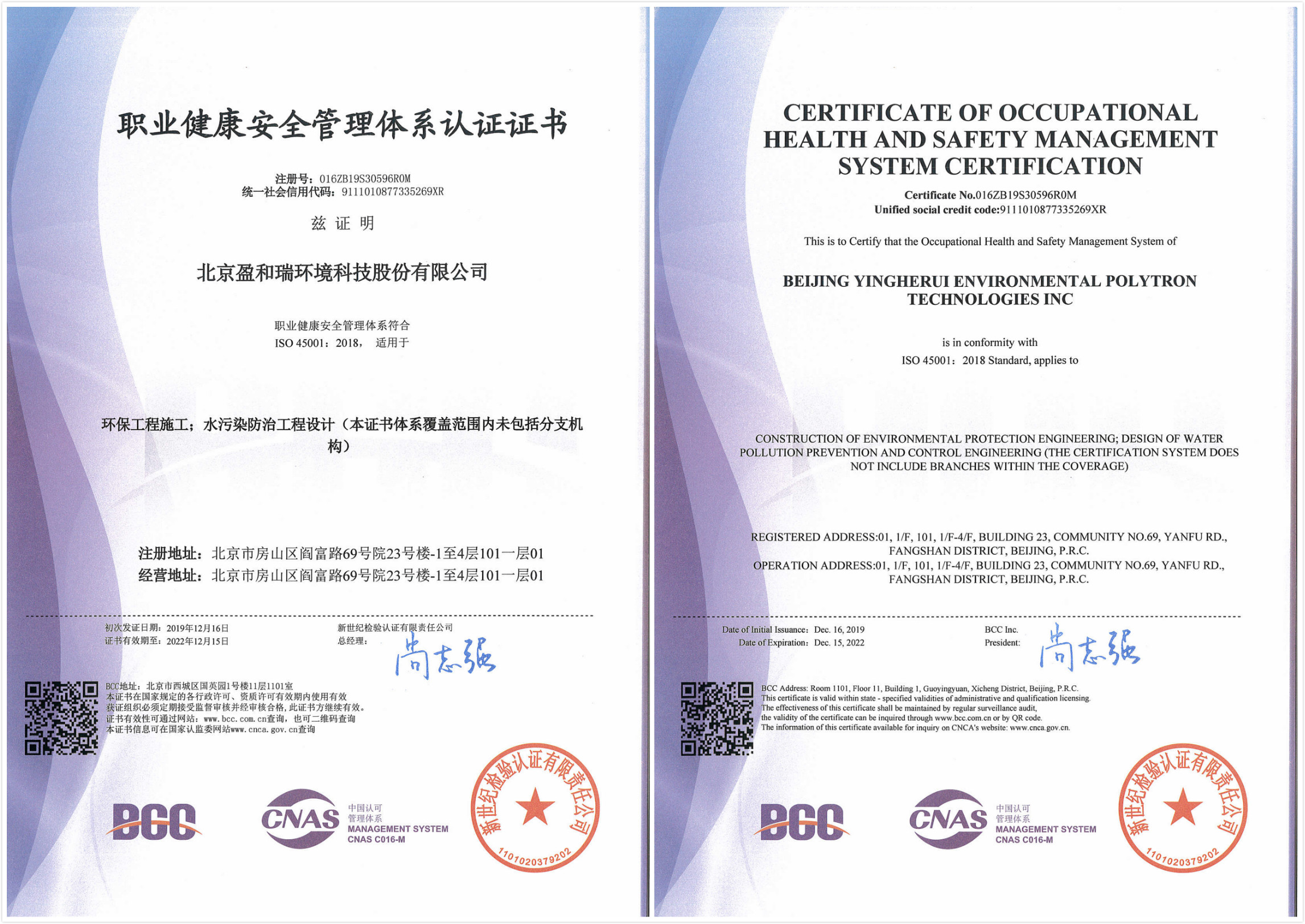 On December 16, 2019, Beijing Yingherui Environmental Technology Co., Ltd. officially obtained GB / T19001-2016 idt ISO9001: 2015 quality management system, GB / T24001-2016 idt ISO14001: 2015 environmental management system and ISO45001: 2018 occupational health Management system certification, which indicates that Yingherui Environment has made new progress in the institutionalized, standardized, procedural and standardized operation process.
