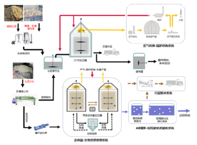 以河北沽源项目为例,我公司采用“蛋白分解+两相厌氧+短程硝化反硝化技术”等核心技术,创造了沼气的高值高产。主要工艺流程如下所示: