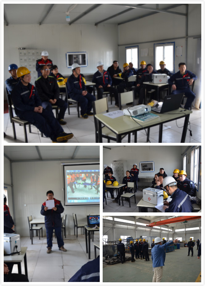 在基地消防安全硬件顺利施工的同时,生产基地的员工们,也在基地常务副主任沙军东、总经理助理徐杰的带领下,举行了“2019年度第一届唐山盈和瑞消防应急疏散演练”,并对全员进行了消防安全培训和急救培训。