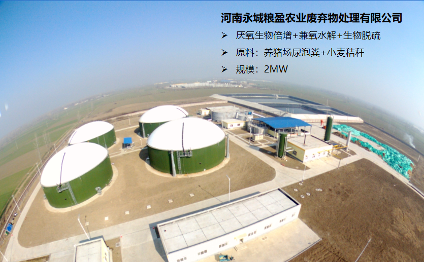永城粮盈以养猪场粪污及小麦秸秆、玉米秸秆为基础原料,以沼气发电和有机肥生产为产品导向,采用沼气发电并网和沼液还田利用相结合的生态化利用模式,工艺流程概述为畜禽粪便经厌氧生物倍增发酵、秸秆采用兼氧水解技术,产生沼气和沼渣液。