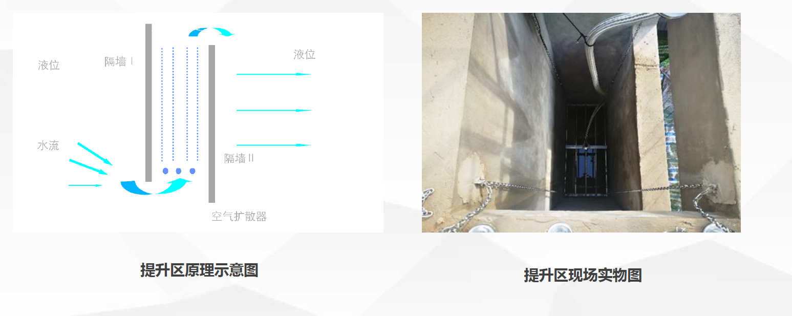 提升区鼓风后,左侧挡墙前后产生气液密度差,实现高效低耗的推流效果,最高回流比可达1000倍以上。