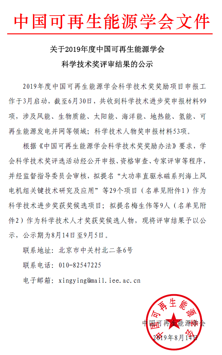 可再生能源学会科学技术奖,由国家科技部和中国科协评奖办公室批准设立,根据《中国可再生能源学会科学技术奖奖励办法》的要求,经过公开申报、资格审查、专家评审等程序,最终评出。其目的是通过奖励在可再生能源科学技术研究和应用领域做出突出贡献的科学家、企业家或对可再生能源发展做出杰出贡献的组织者,促进可再生能源科技事业的发展。