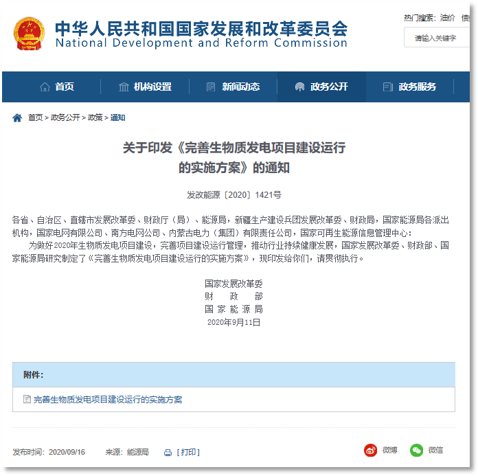 为深入贯彻习近平生态文明思想,落实“四个革命、一个合作”能源安全新战略,进一步促进生物质发电等可再生能源发电行业健康发展,9月16日,国家发展改革委、财政部、国家能源局近日联合印发了《完善生物质发电项目建设运行的实施方案》(简称《方案》)。